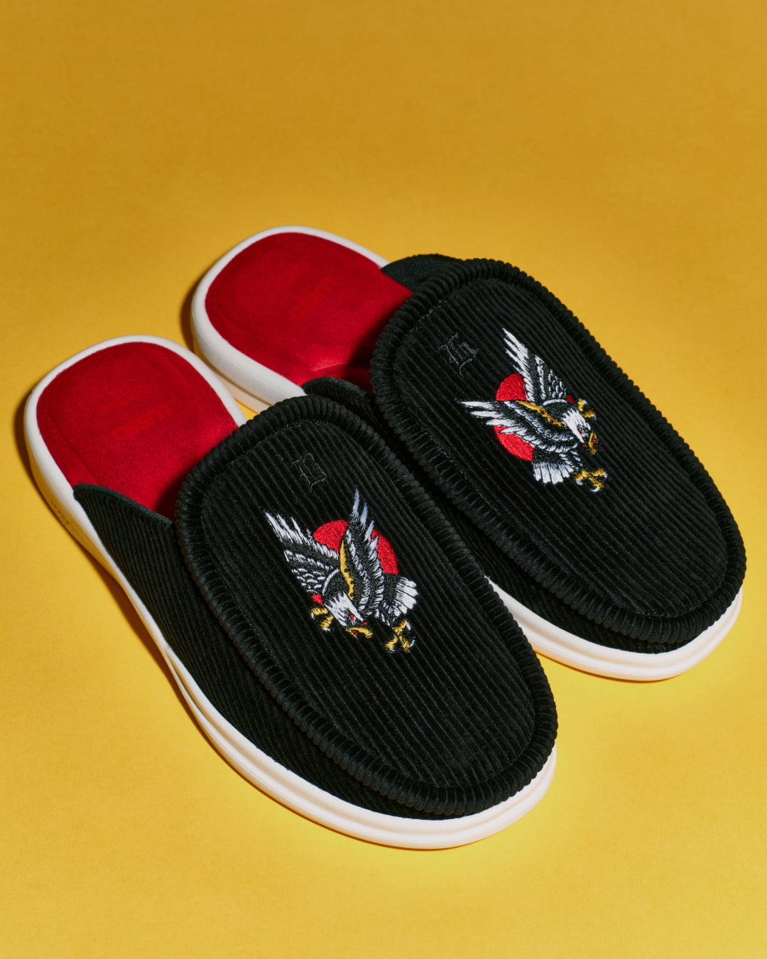 The latest chapter in our ongoing partnership with Brooklyn tattoo artist Bert Krak. The Esto, crafted in black wide-wale corduroy with a red micro suede footbed and an embroidered eagle in Bert’s signature hand. Available now.