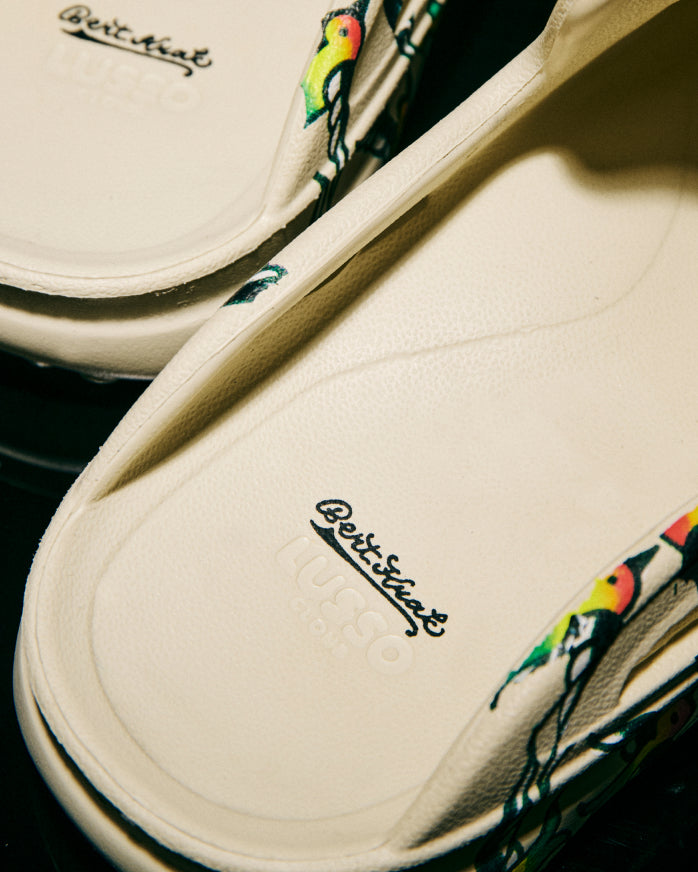 This new limited collection in collaboration with Bert marks our second project together, following the overnight sellout of our initial release. In this round, he features his signature heavy line work on two silhouettes: an embroidered high-contrast skull and bones design on The Esto, and a signature Sparrow print on The Scenario.