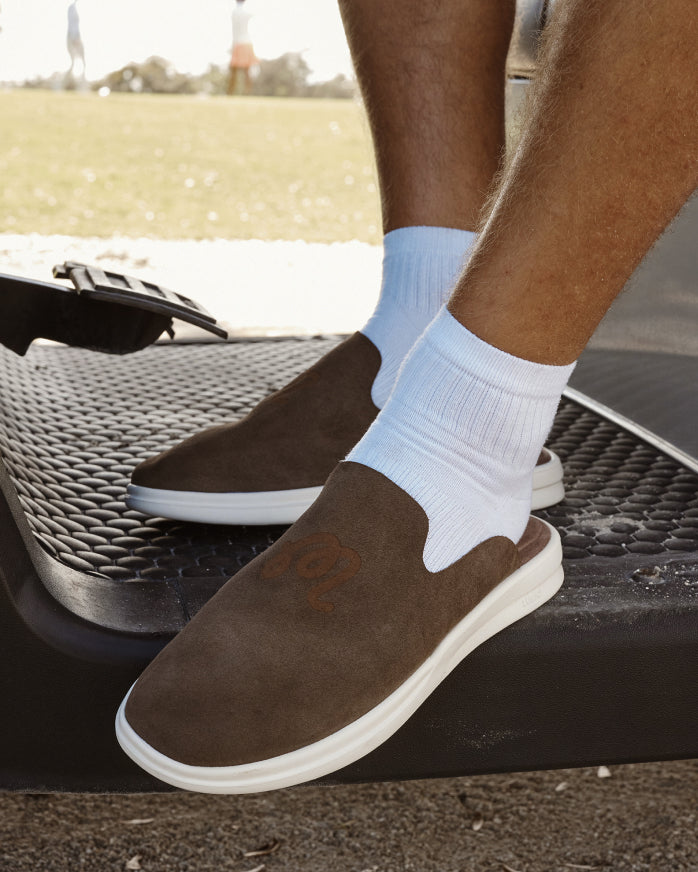 Crafted in premium suede in Desert Willow or Tan Falcon, with our patented Triple Stack Cozy Footbed, a lightweight, durable outsole, and a laser-etched Malbon M Script finish. Designed for easy on, easy off—from clubhouse to city.