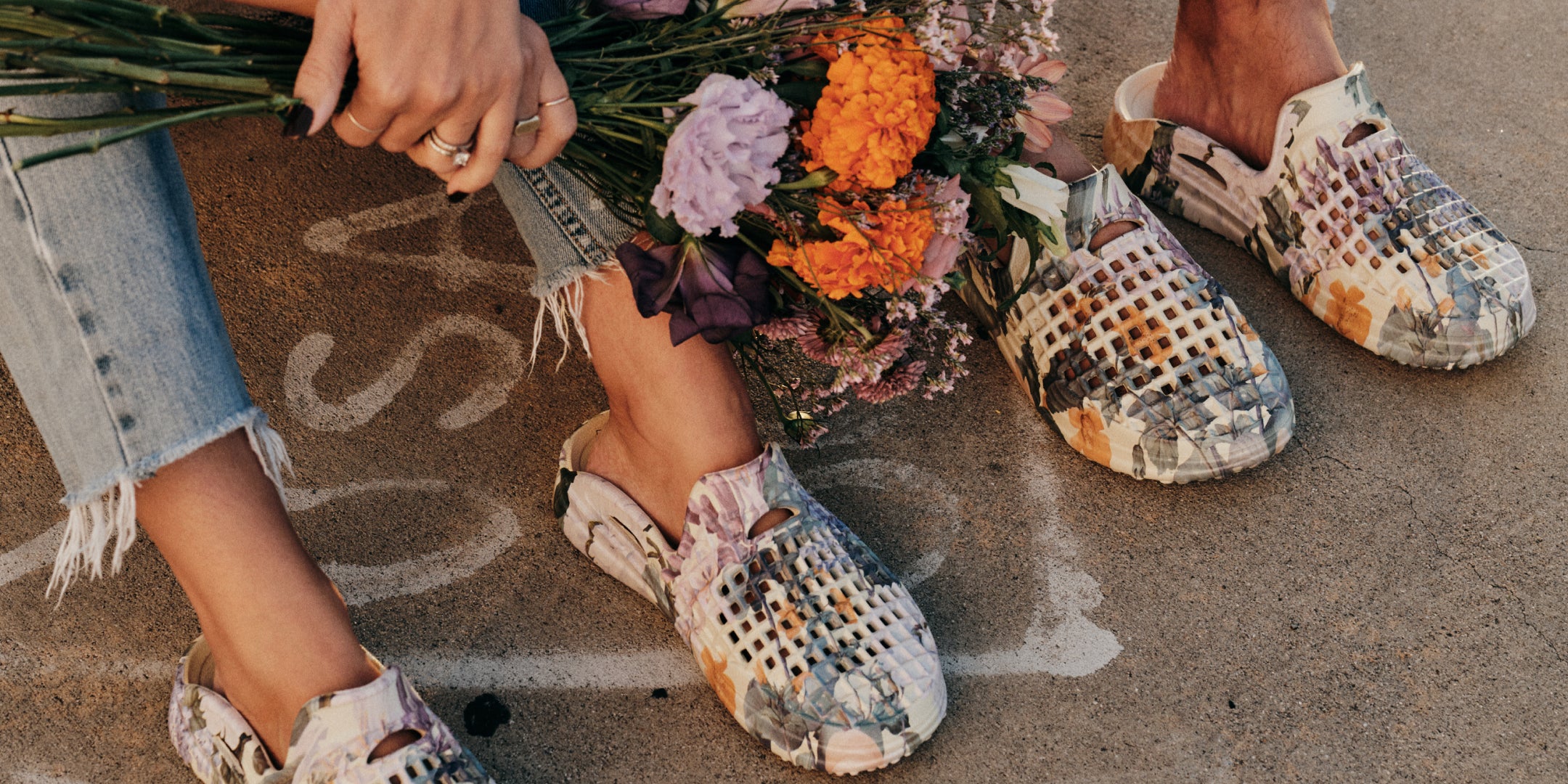 Justin and Ali added their signature style to their go-to pre- and post-golf shoe, The Scenario Slide. Their inspiration: a garden of florals.