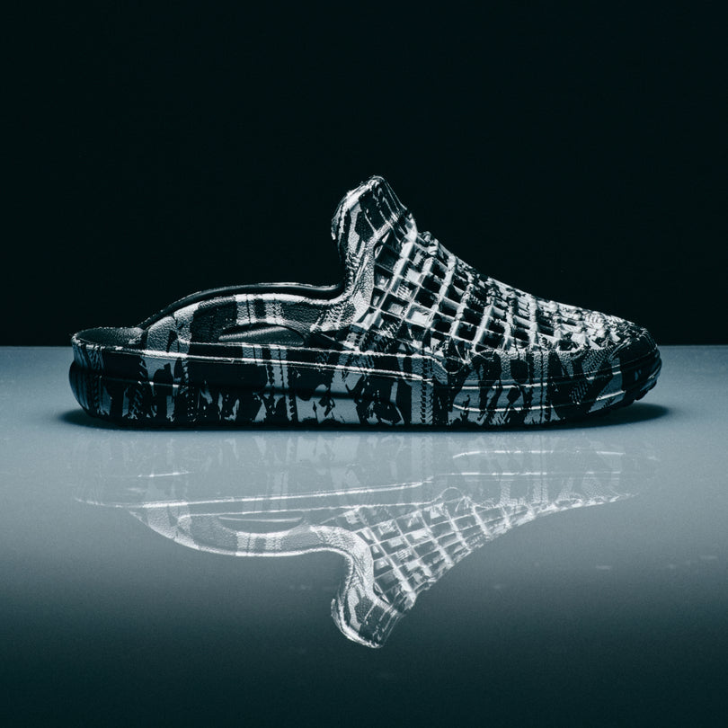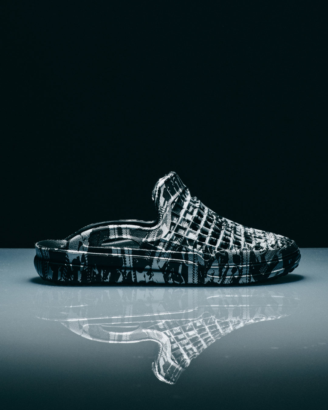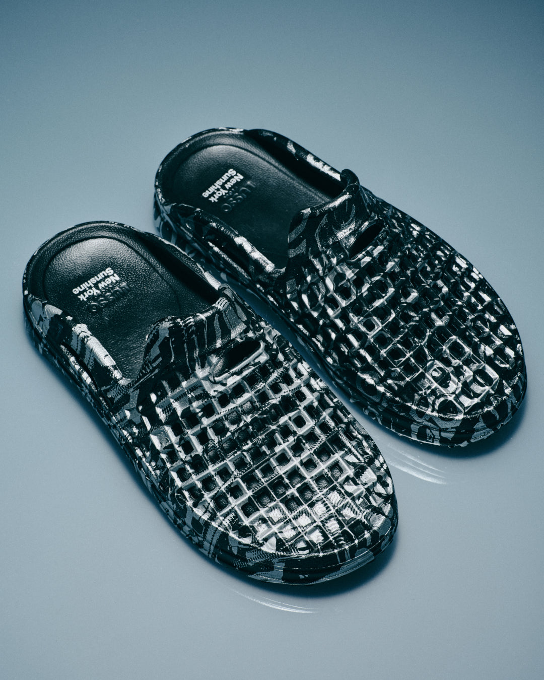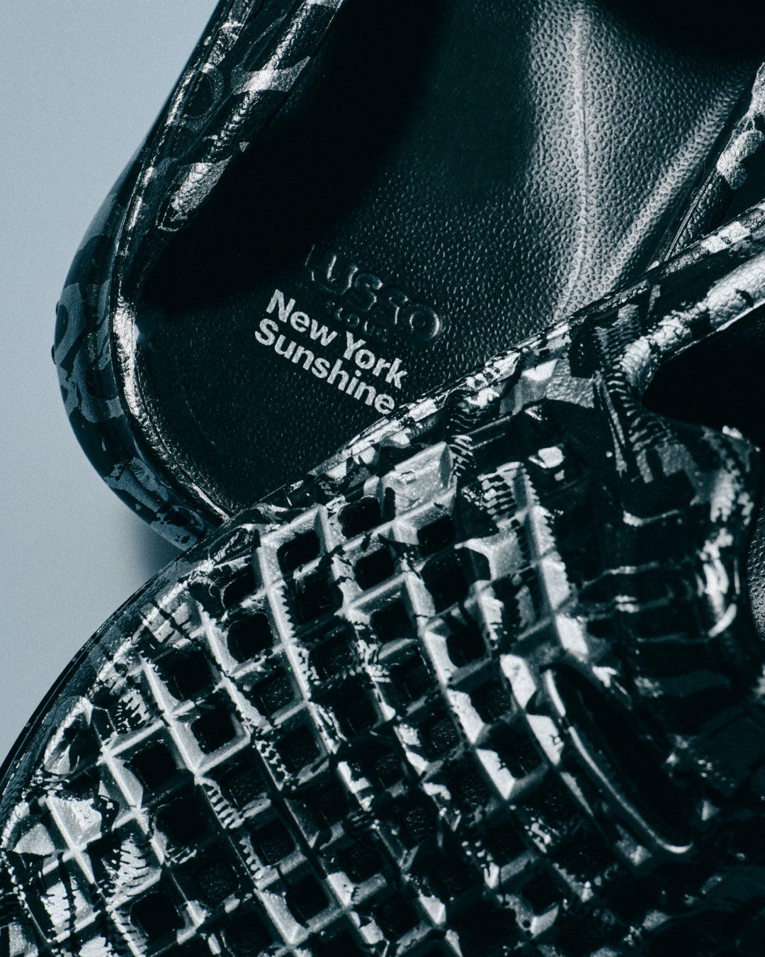 The official “DONE FOR THE DAY” slide of the New York Sunshine INSTALL TEAM. The Scenario Slide in Jet Black with a chrome nuts and bolts print. Each pair comes with a raw canvas shoe bag featuring the signature collab graphic: “just screw it.”