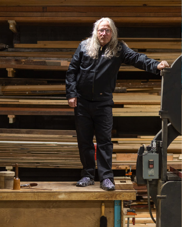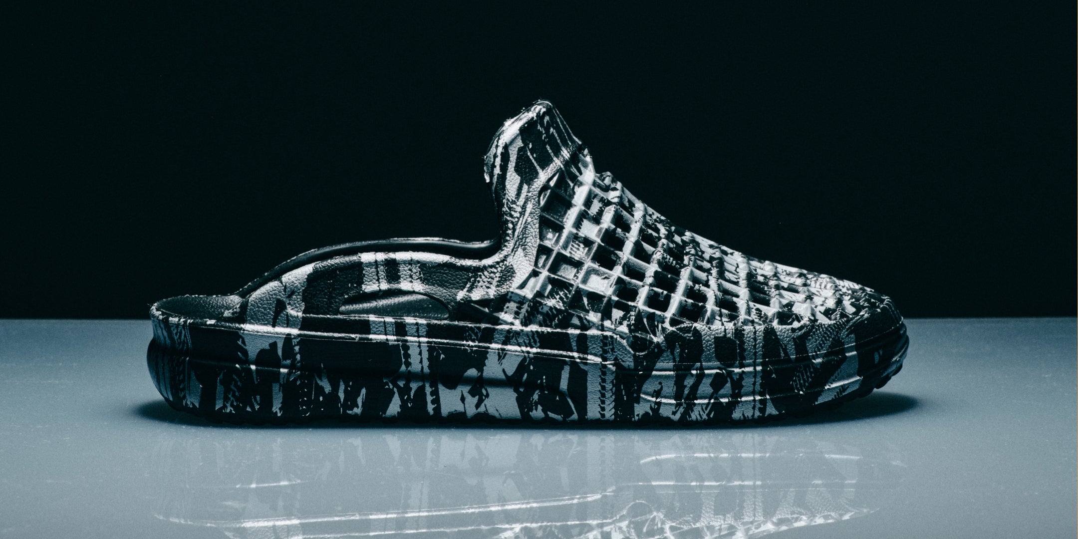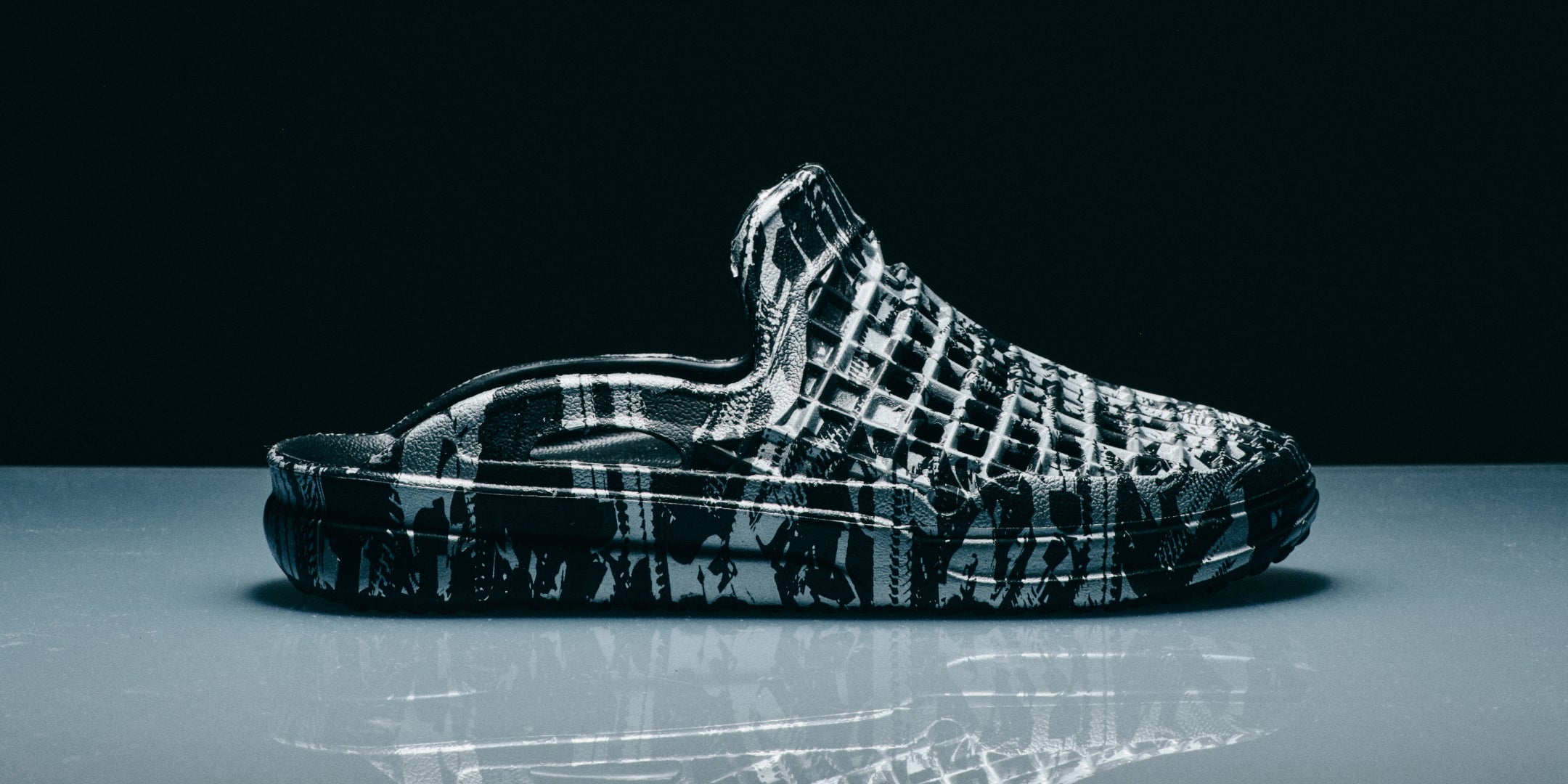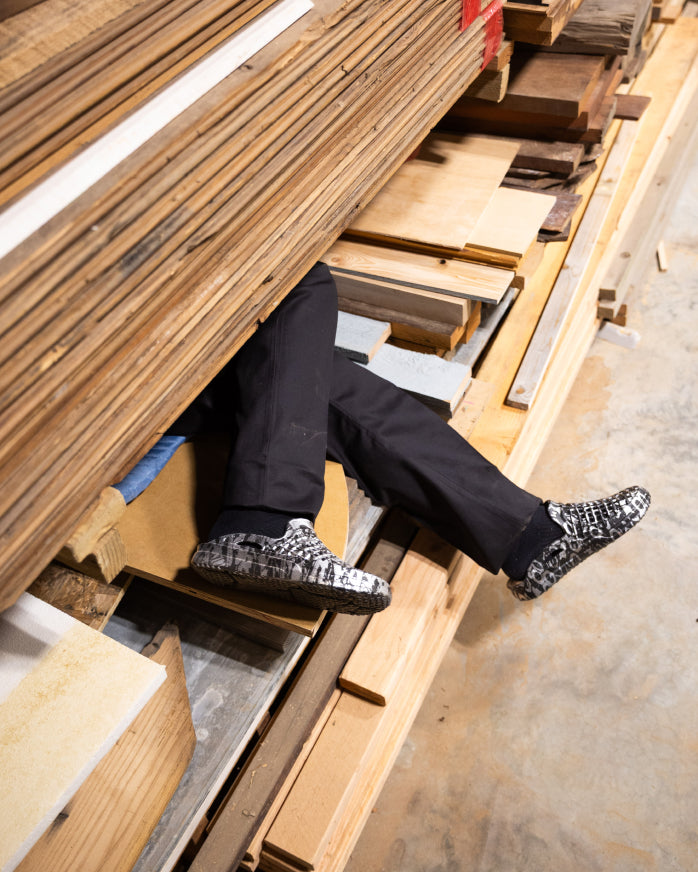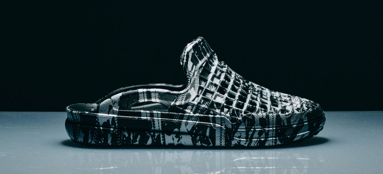 The official “DONE FOR THE DAY” slide of the New York Sunshine INSTALL TEAM. The Scenario Slide in Jet Black with a chrome nuts and bolts print. Each pair comes with a raw canvas shoe bag featuring the signature collab graphic: “just screw it.”