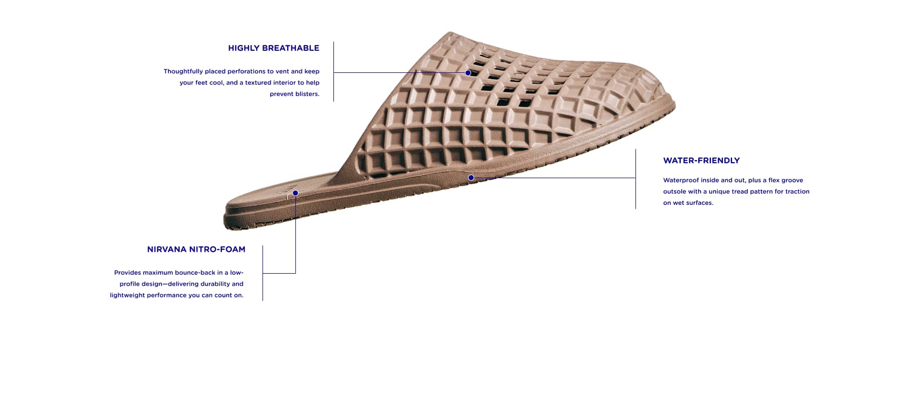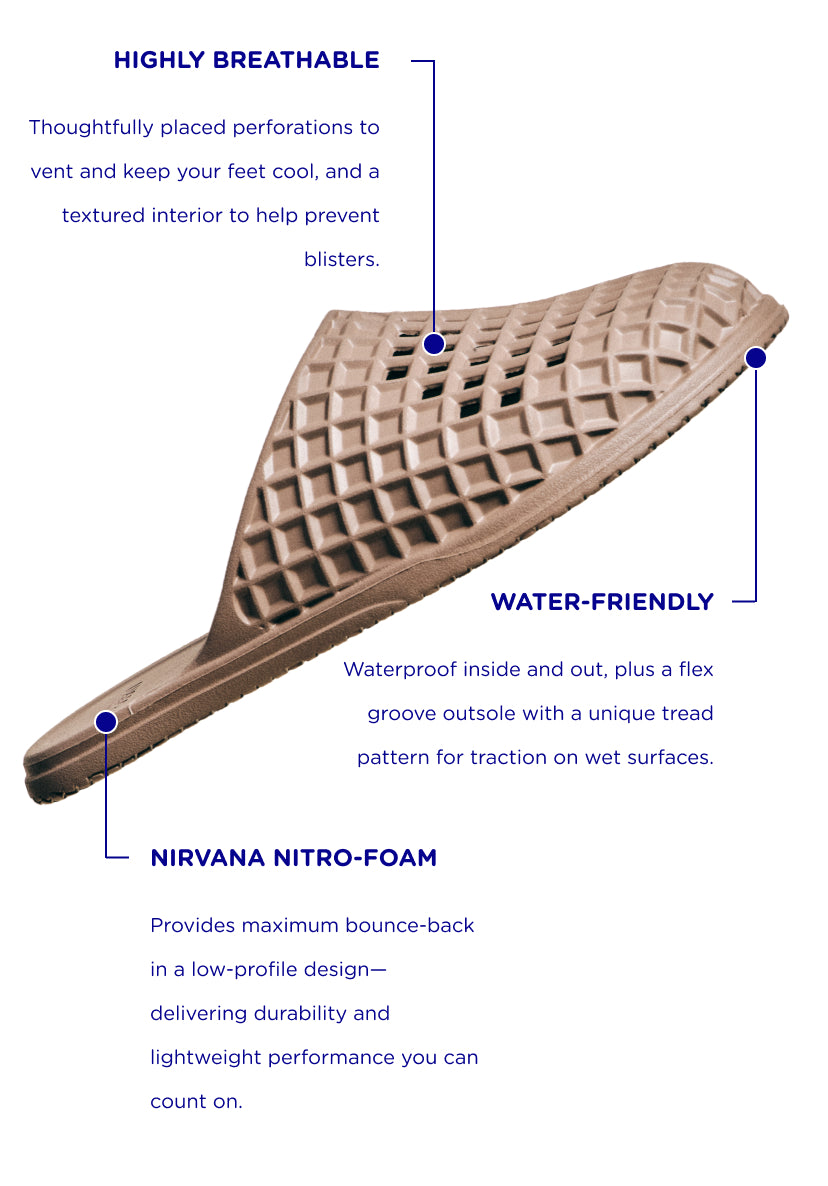 A timeless, low-profile unisex silhouette. Water-friendly, built-in arch support, internal texturing to reduce hot spots, antimicrobial, and our patented square perforation for maximum airflow.